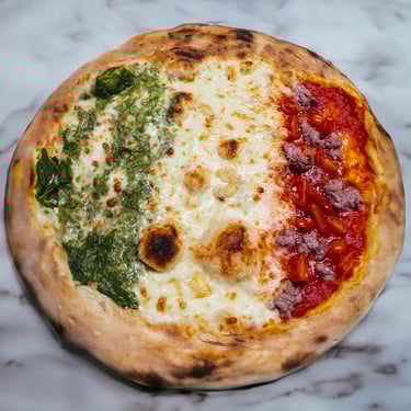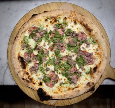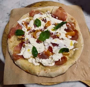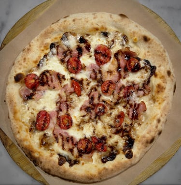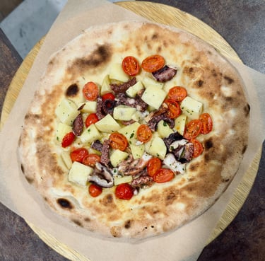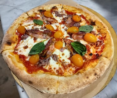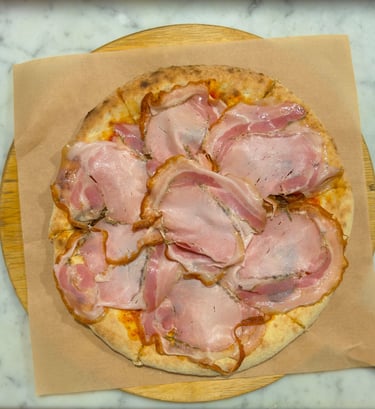 Pizza artigianale, ingredienti italiani. Cotta in forno a legna.